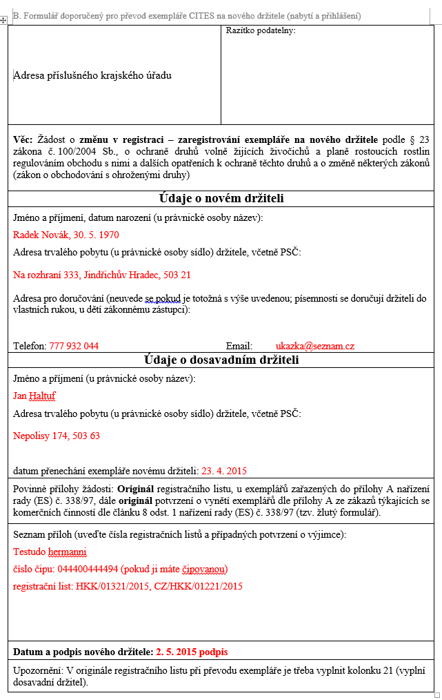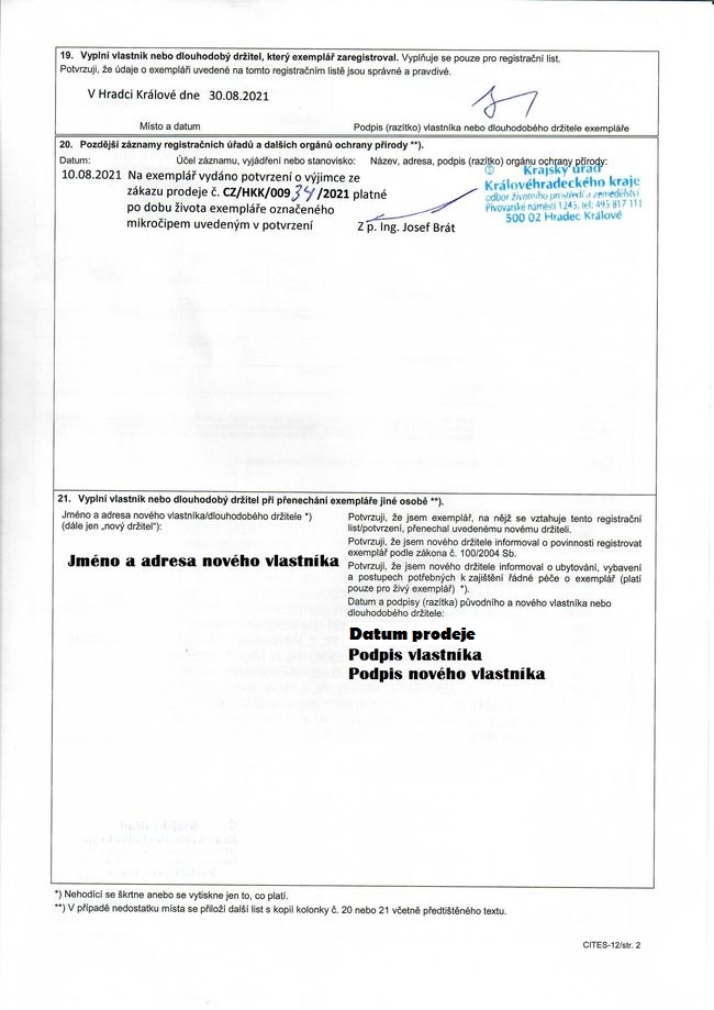 Na úřad odesíláte fyzicky všechny doklady CITES (originál) + vyplněný formulář pro převod exempláře. Můžete si udělat kopii dokladů, které si doma ponecháte pro případ, že by se doklady ztratily. Úřad vám po registraci doklady pošle poštou zpět.
