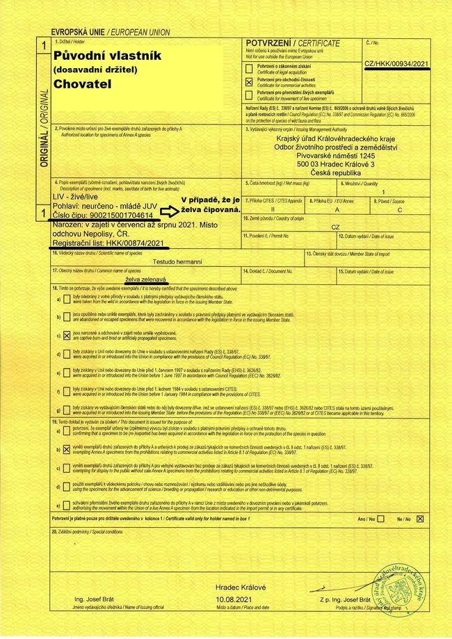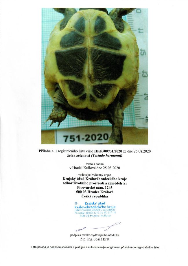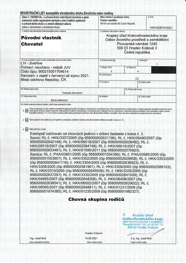 Při koupi želvičky obdržíte doklady CITES, viz foto níže, a dále pro ulehčení registrace vám dáme formulář pro převod exempláře s adresou vašeho příslušného kraje, kde budete želvičku registrovat.